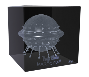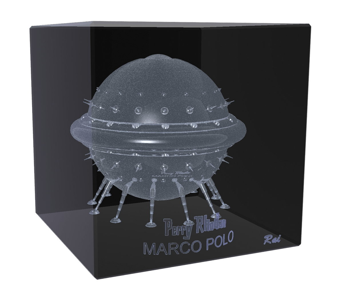 Raimund Peter hat das 3D-Modelle gestaltet, das von der Firma 3D-Glas aus Graz in Glasblöcke gelasert wird. Der PERRY RHODAN-Schriftzug macht sie zu offiziellen Lizenzprodukten der Serie. Der Würfel wird in einer ansprechenden Verpackung geliefert, die mit schwarzem Samt ausgepolstert ist.