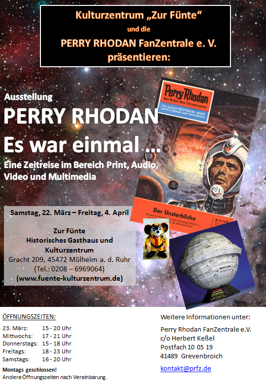 Dies nahm der Künstler und Perry Rhodan-Fan Frank Bruns, auch unter dem Pseudonym Francis Brown bekannt, zum Anlass im Museum Fuente, dem regional sehr bekannten Kulturzentrum in der schönen Ruhrgebietsstadt Mühlheim an der Ruhr vom 22. März – 04. April 2014 eine große Perry Rhodan Ausstellung zu präsentieren.
